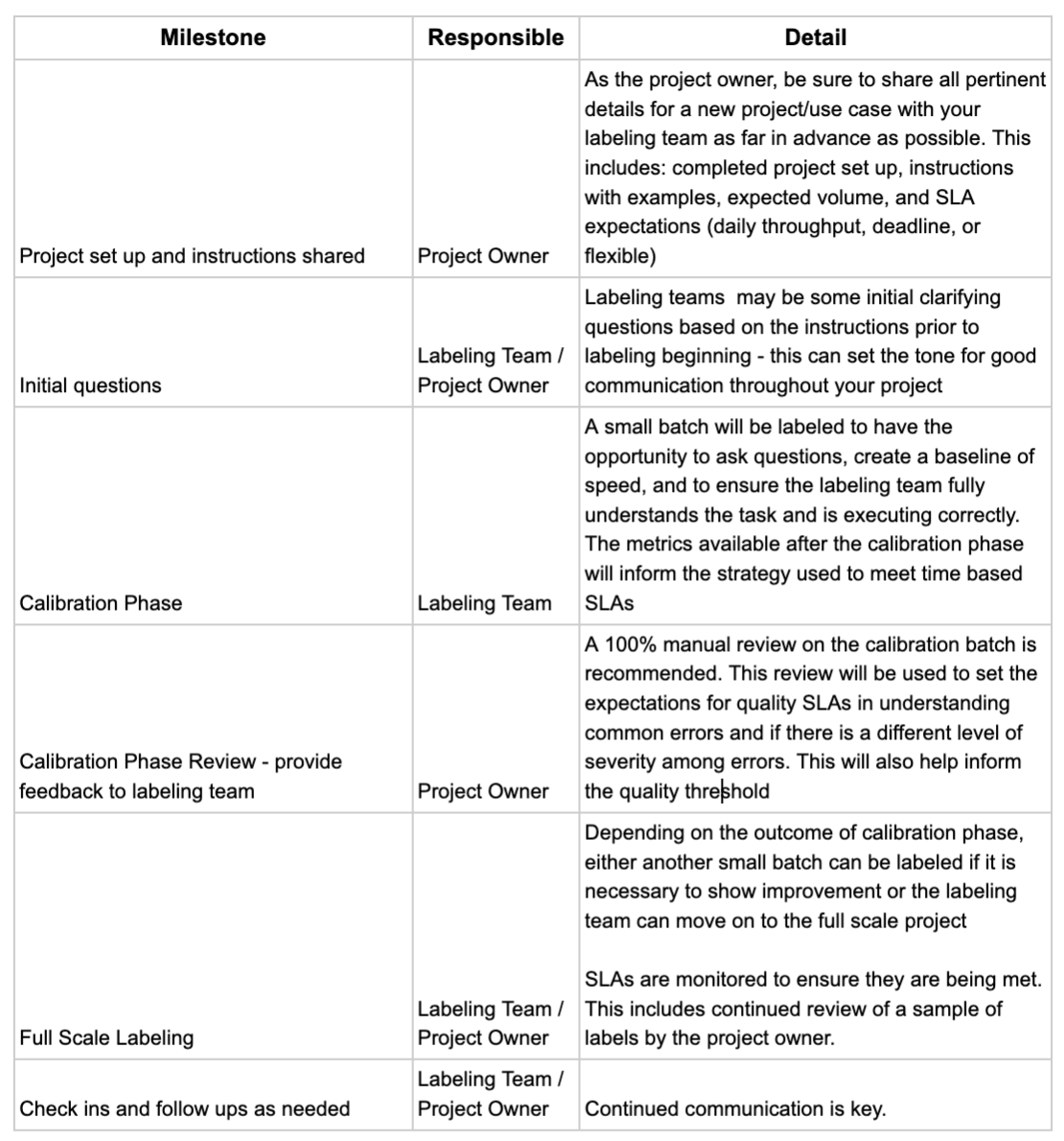 Below you will find a table that outlines the milestones of implementing a quality SLA and assigns responsibility for each to a particular party. As stated, a well executed quality SLA is bidirectional and involves the continued involvement of the project owner, ensuring good quality labels is a shared responsibility.