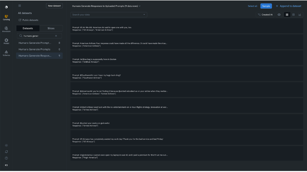 For our project, we'll want to create a "Humans generate responses to uploaded prompts" project. Namely, we want humans to create responses in the form of a list of airlines.