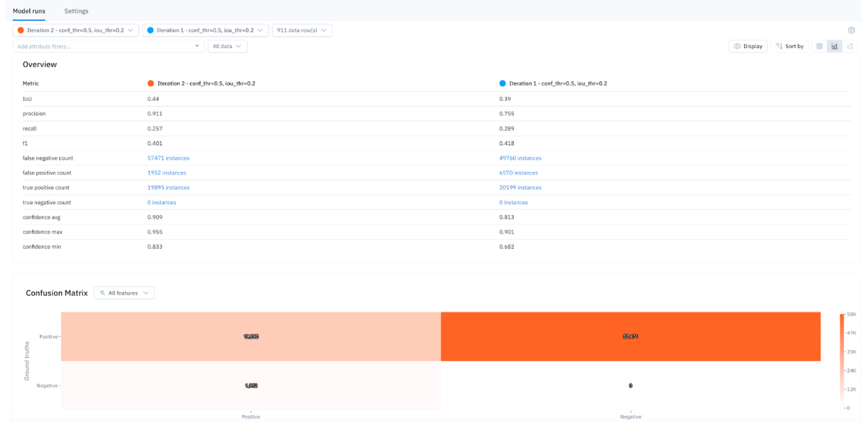 Real-world conditions and data are often dynamic. As the use case evolves, it's crucial to maintain representativeness and relevance in the fine-tuning data. Continuous evaluation of the fine-tuned model’s performance can help detect edge cases or model errors. You can evaluate model performance and debug errors leveraging Labelbox Model. Utilize interactive auto-populated model metrics, such as a confusion matrix, precision, recall, F1 score, and more to surface model errors. Detect and visualize corner-cases where the model is underperforming and generate high-impact data to drastically improve model performance. After running error analysis, you can make more informed decisions on how to iterate and improve your model’s performance with corrective action or targeted data selection.