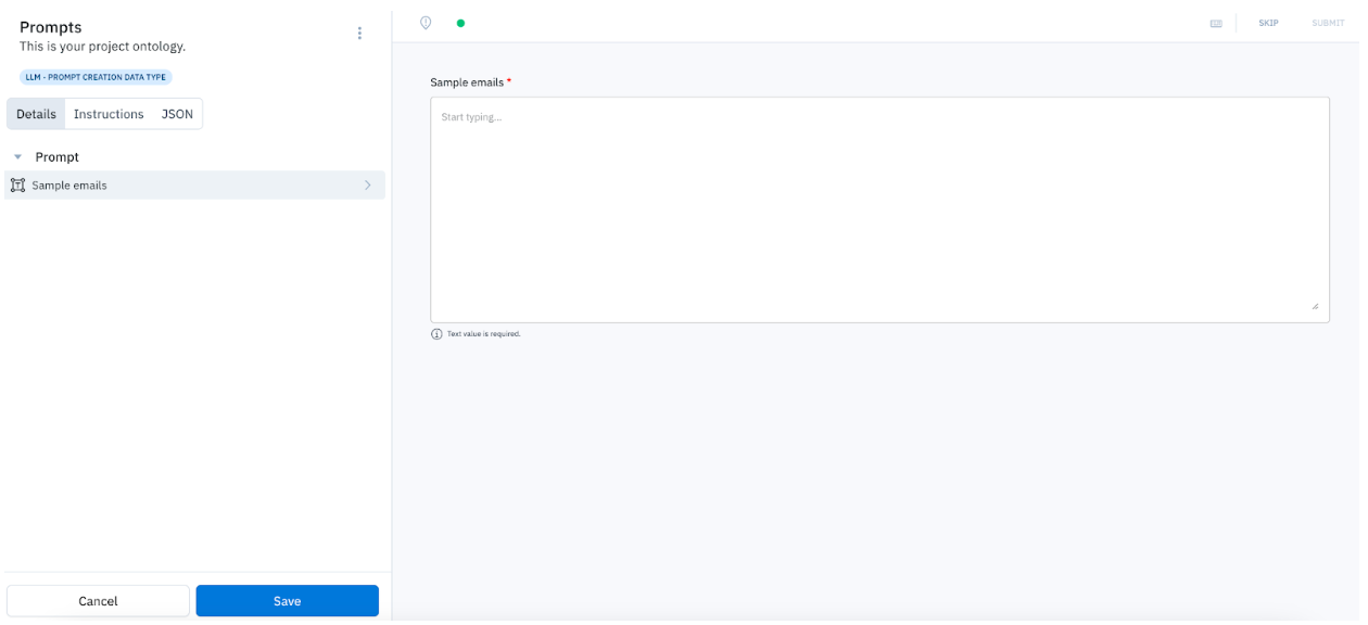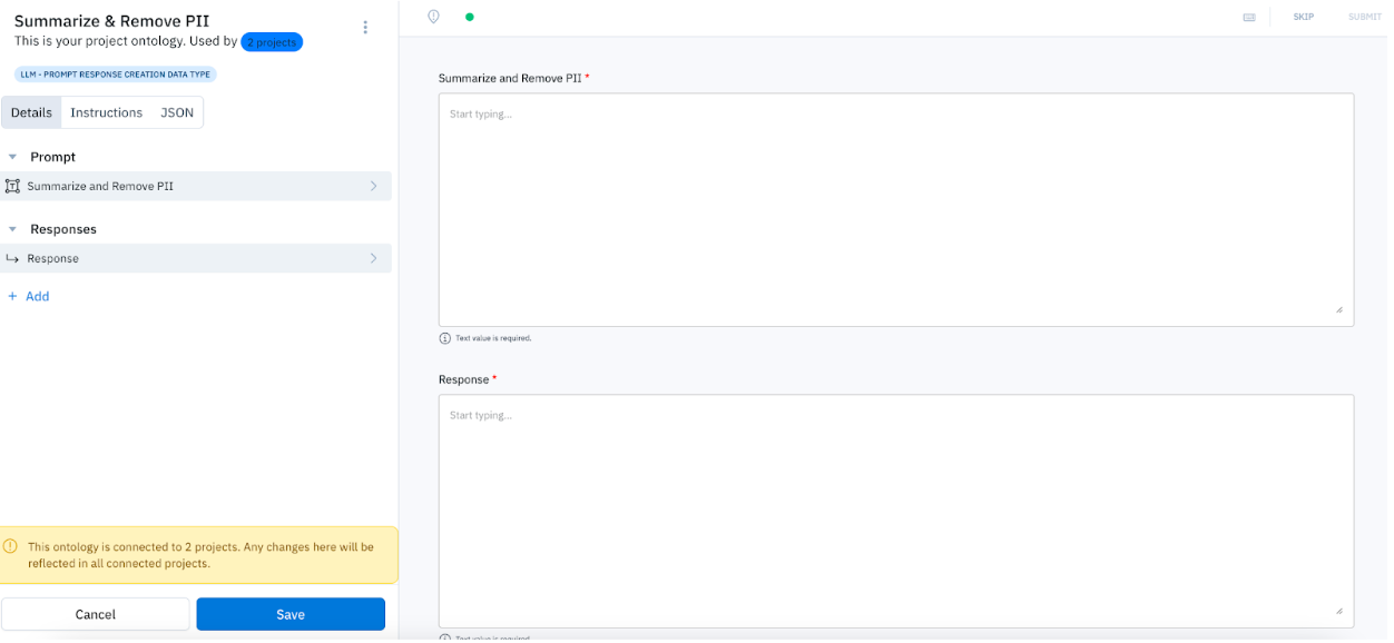 In the editor, the prompt and response fields will be required. This will indicate to your team that they should create a prompt and response from scratch.