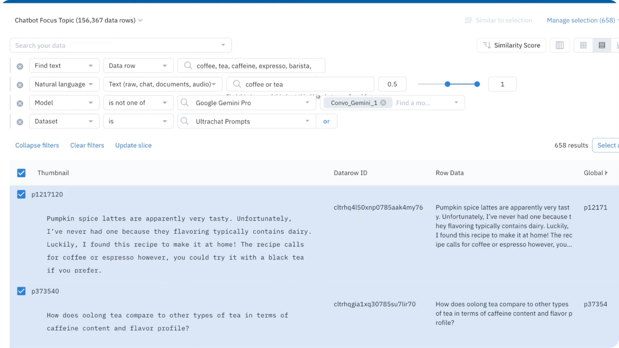 - Using Labelbox Catalog, you'll identify the relevant prompts related to coffee, and you can combine filters such as:
