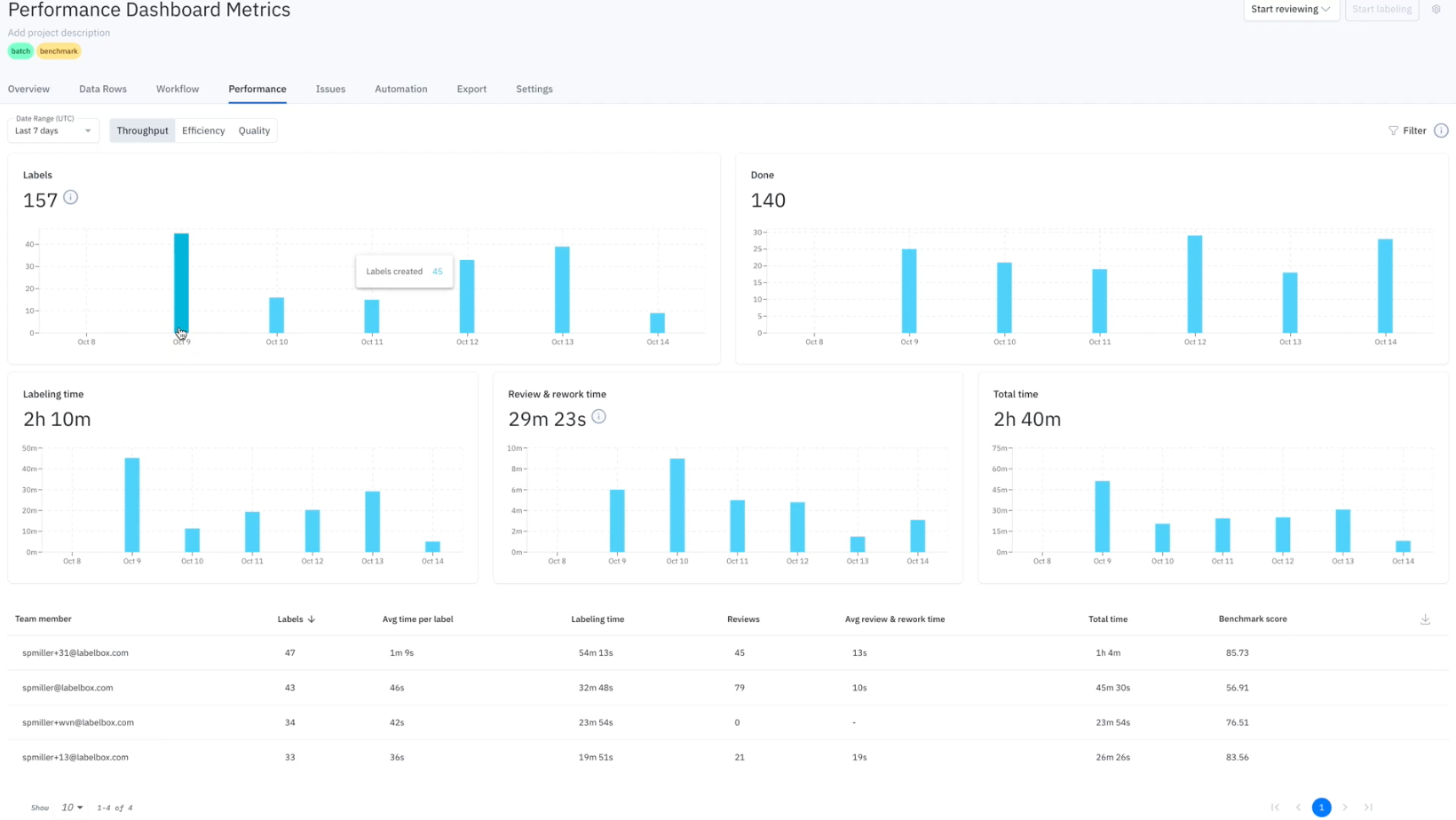 As one of the primary tools for managing your labeling operations in a Labelbox project, you have a holistic view of your project's throughput, efficiency, and quality throughout the labeling process.