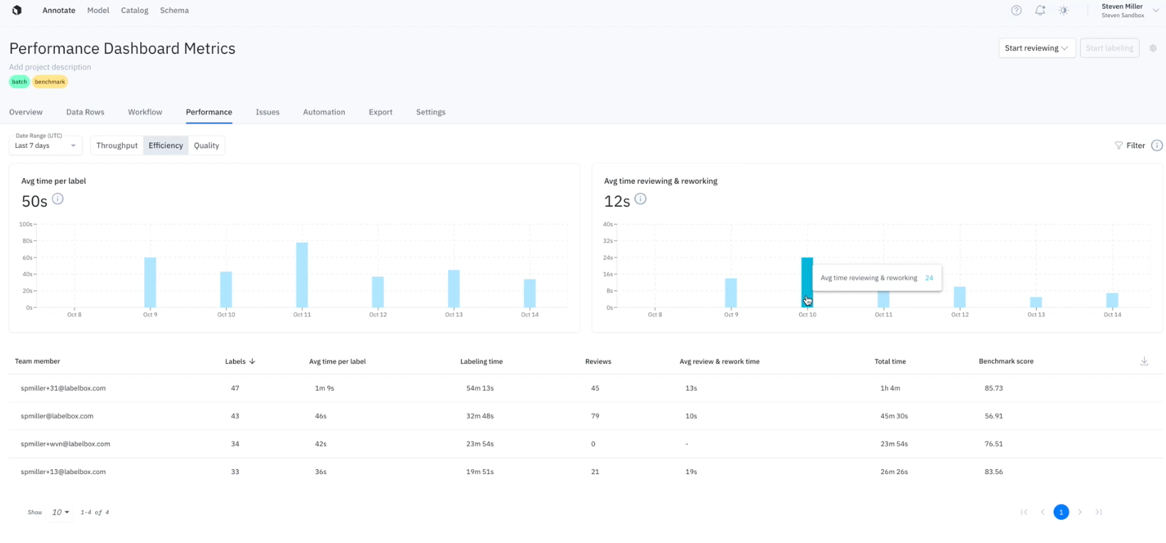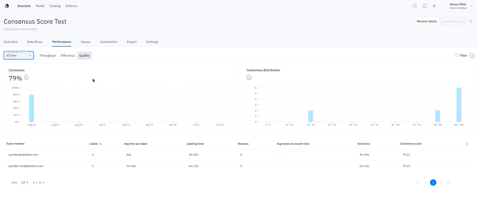 Each of the above metrics are reported at the overall project level and at the user level, giving you a single source of truth for your project's annotation and labeler analytics.