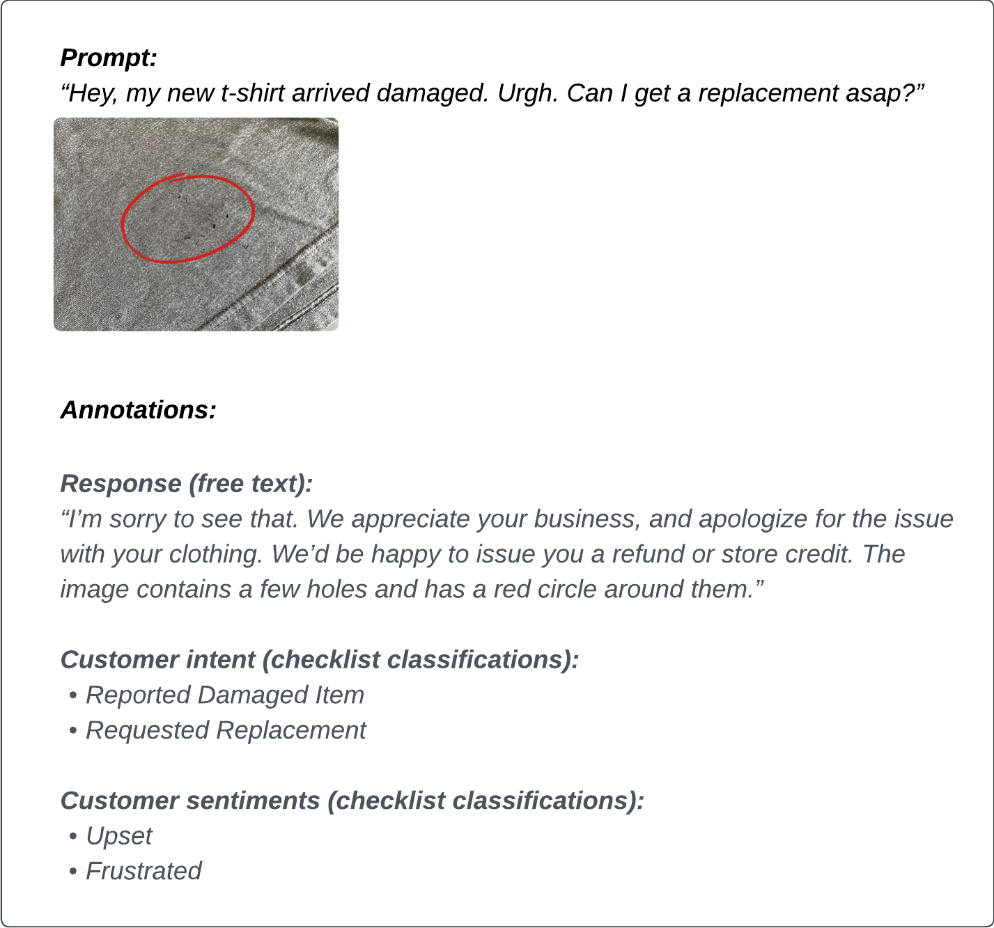 Furthermore, the customer appears to be reporting their order was damaged and is requesting a new one, so both of those requests are labeled using checklist classifications.