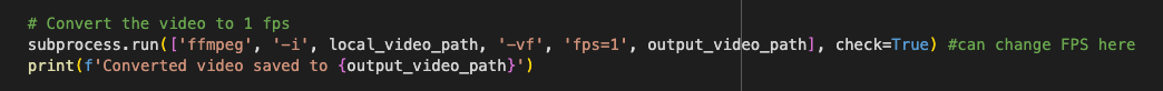 - Using the ‘ffmpeg’ tool, the video is converted to 1 frame per second (FPS). This step is crucial and can be easily modified to change the FPS by altering the ‘-vf fps=1’ parameter in the ‘subprocess.run’ command. For example, to convert the video to 2 FPS, you would change ‘fps=1’ to ‘fps =2.