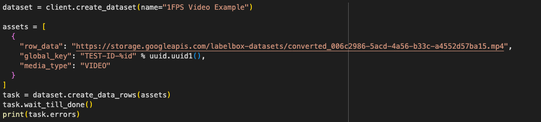 - Video Upload: Converting a video to 1 FPS and uploading this converted video into Labelbox Catalog.