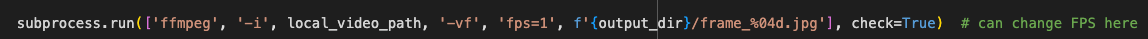 - Using the ‘ffmpeg’ tool, the video is processed to extract frames at 1 frame per second. Again, this can be easily adjusted by changing the ‘-vf fps=1’ parameter in the ‘subprocess.run’ command to any desired frame rate.