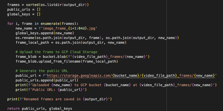 - Public URLs and global keys for each uploaded frame are generated and stored for later use.