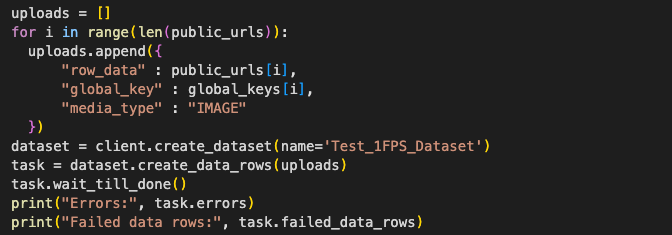 - The extracted frames are uploaded to Catalog by creating a dataset and adding each frame as an individual data row, using the Labelbox SDK.