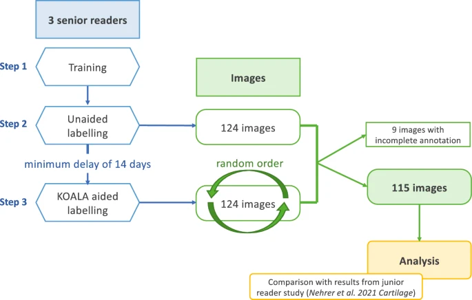 How Labelbox was used: The entire labelling process was divided into 3 steps. First, three senior readers were trained on the structure of the AI software report, OARSI grading system labelling process and the Labelbox platform was used. Second, readers assessed—unaided (i.e. without AI annotations)—124 plain knee X-rays and defined KL grade, osteophytes, sclerosis, and JSN by completing a list. The readers were able to work remotely at their preferred time and allowed to interrupt and resume labelling at any time, without time restrictions for labelling individual images or the entire dataset. However, the time it took readers to label each image, as well as the time of the entire labelling process. Third, after a minimum of 2 weeks after the second step had been completed, the same 124 knee X-rays were relabelled by the readers, with images provided at random order (to avoid creating observer bias. At this point, however, each image was supplemented with the AI software’s report together with a binary score of whether OA was present on the X-ray.
